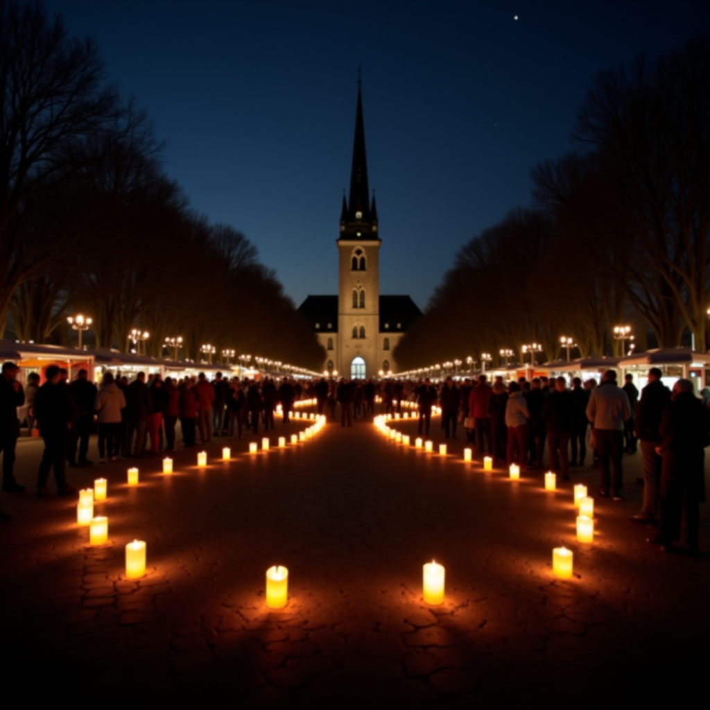 4. In de avonduren werd een lange lichtketting rond de plek van de aanslag gevormd. Rond 19.00 uur, het tijdstip waarop de aanslag plaatsvond, luidden de kerkklokken in de stad.