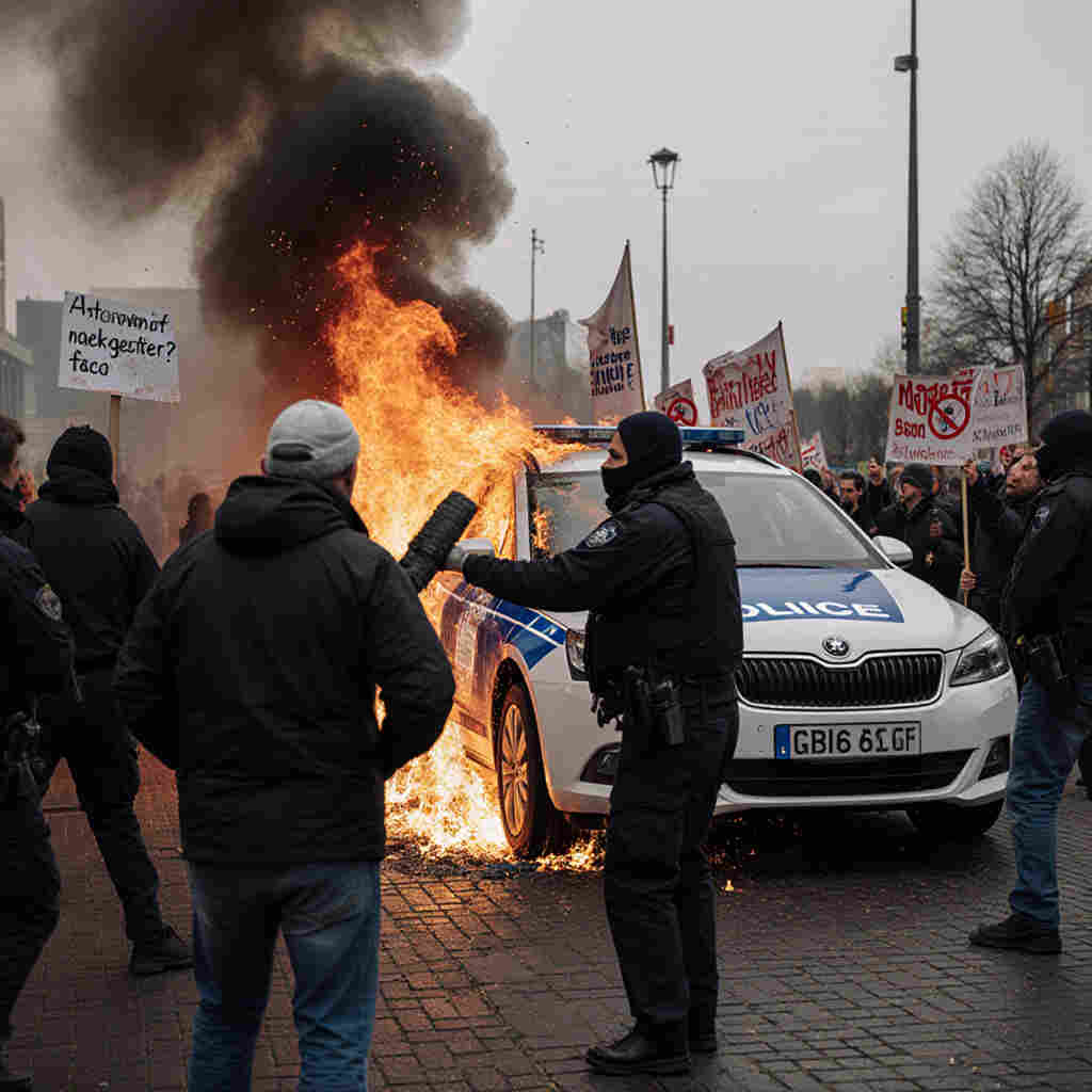 5. Relschoppers renden de A12 op, gooiden met stenen en staken een politieauto in brand.